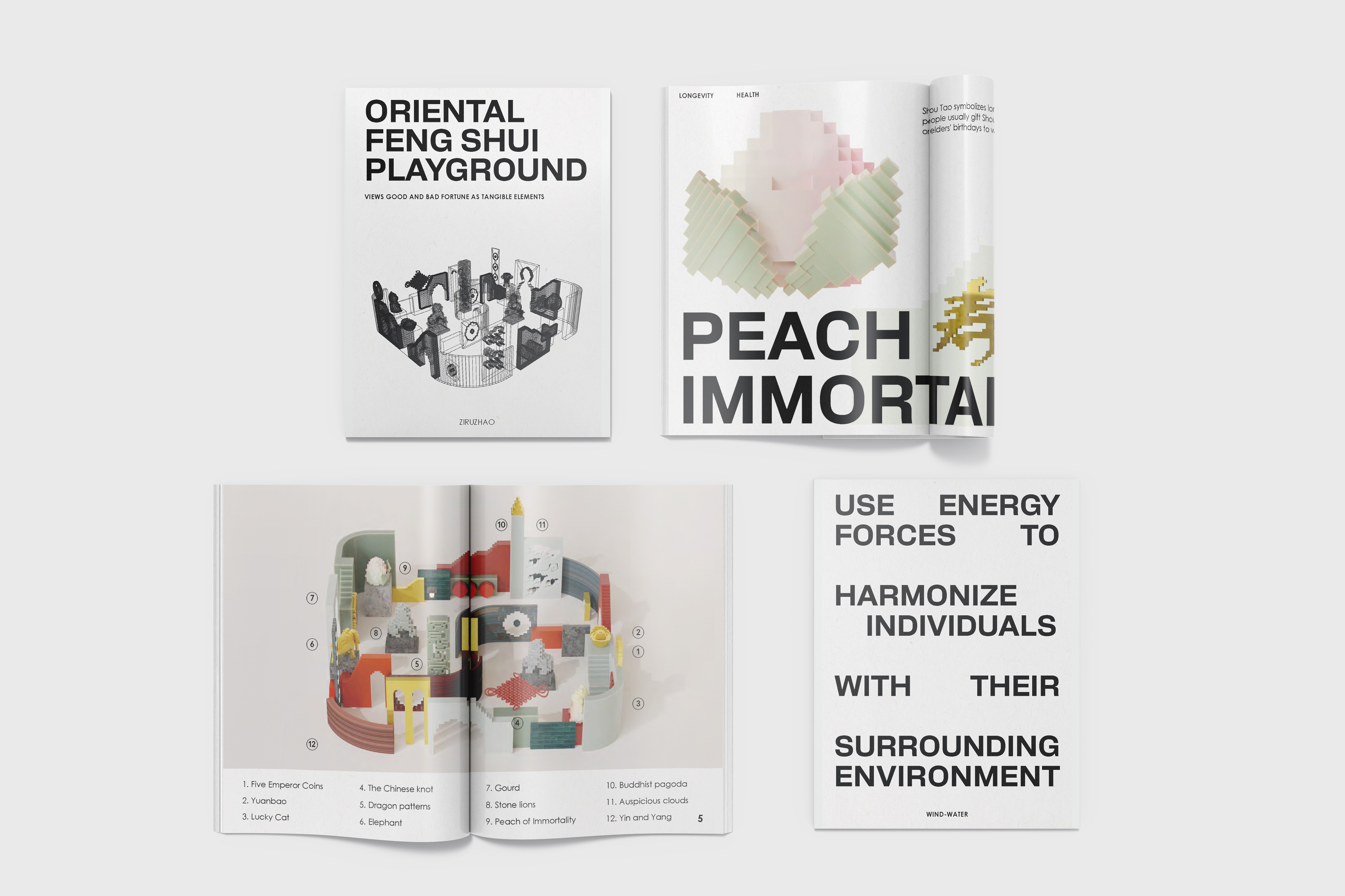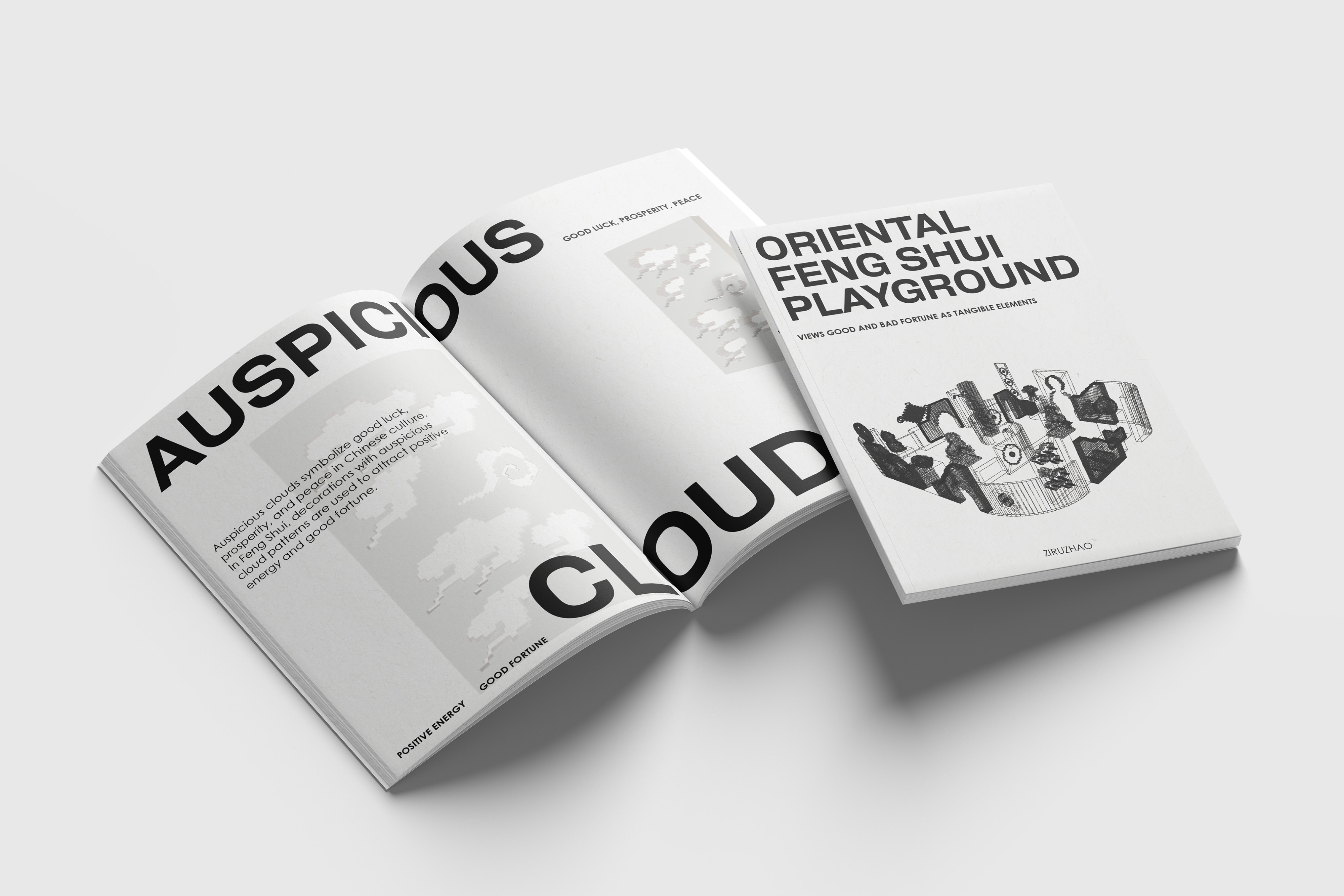 Oriental Feng Shui Playground is a cross-media design project that translates traditional Feng Shui symbolism into an interactive spatial experience. The work combines 3D modeling, editorial zine design, and a Unity-based VR environment to reframe cultural knowledge through contemporary visual language.